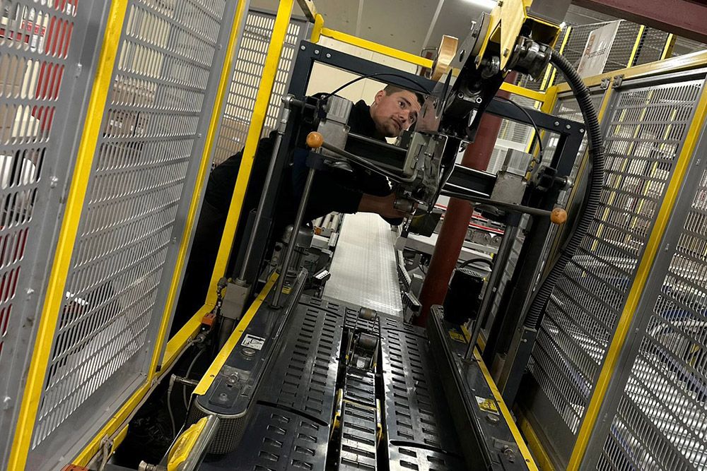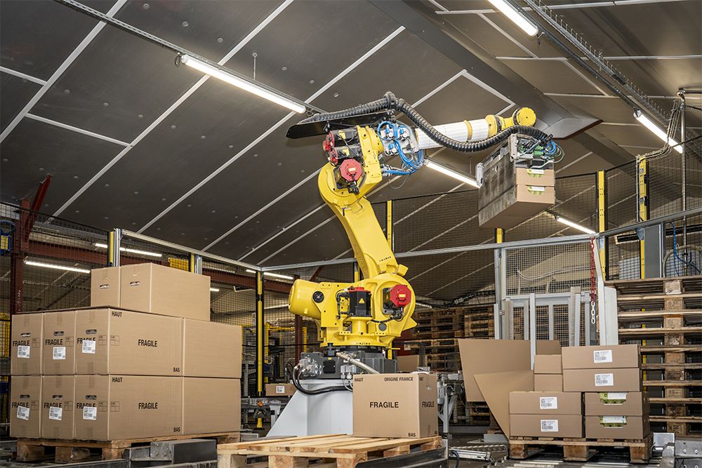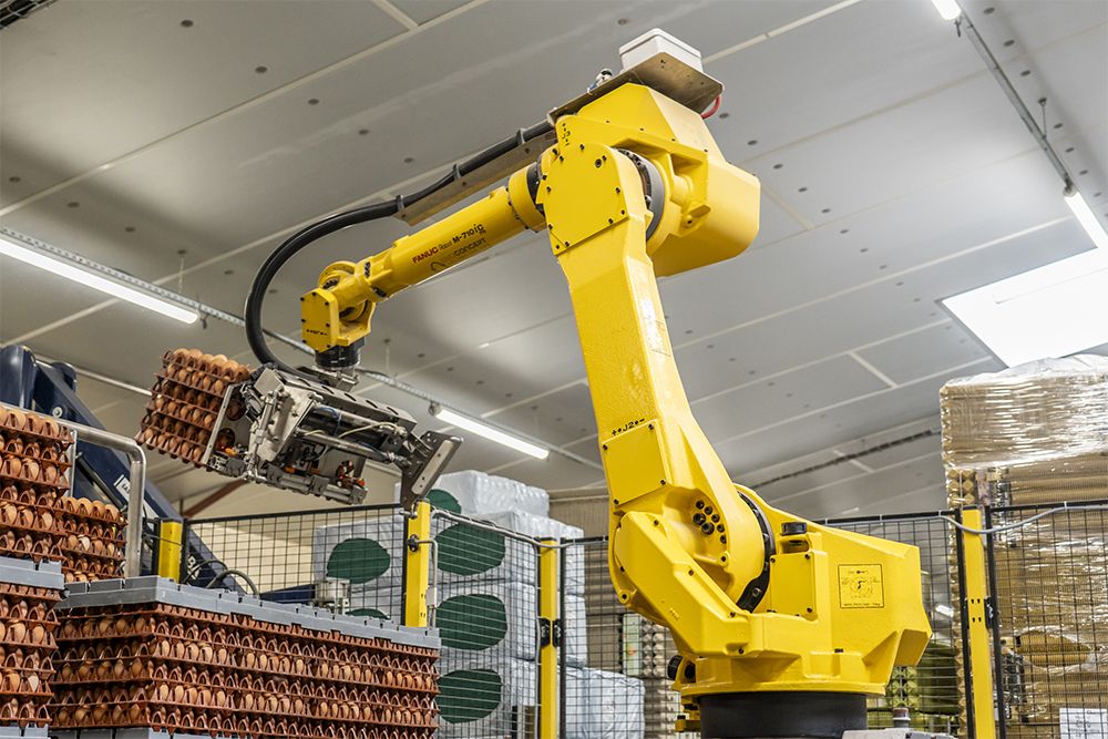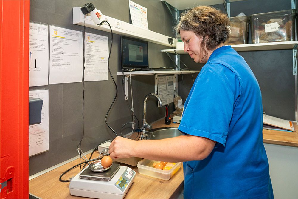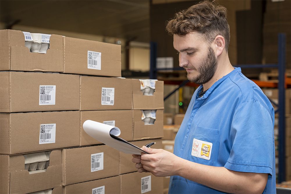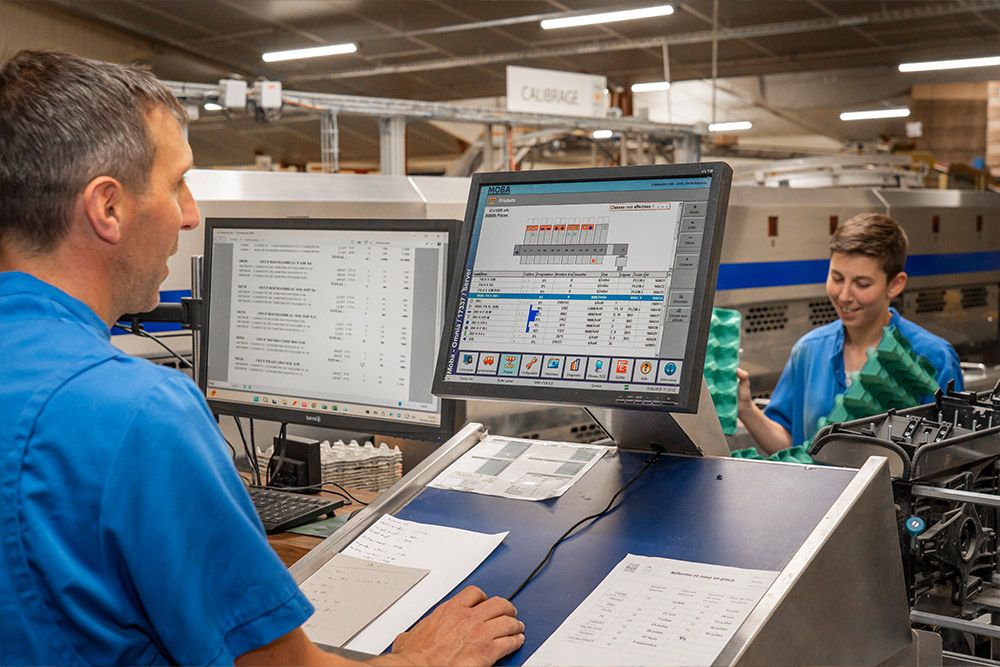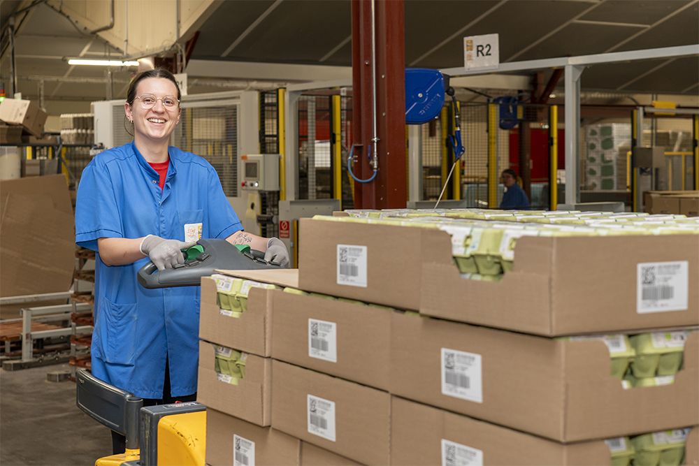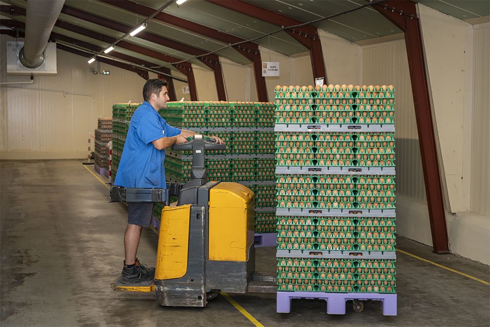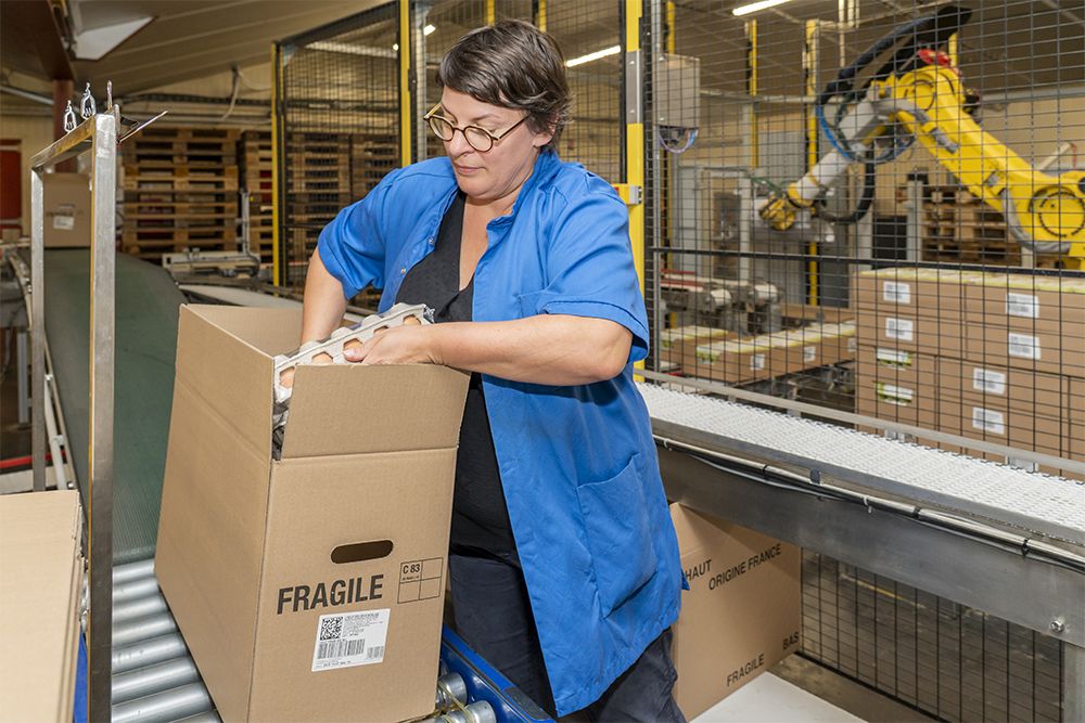 Les œufs soigneusement calibrés sont conditionnés dans des boites éco‑responsables, préparés en colis via des automates, puis palettisés. Notre système de lecture caméra assure que chaque palette correspond exactement à la commande (enregistrement de la traçabilité), avant d’être filmée et expédiée.